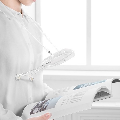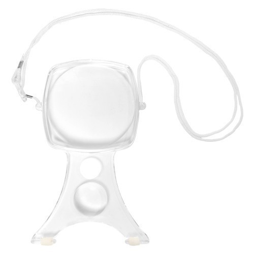 PRODUCT RA-6404 Neck Magnifier ● Size / 210 x 130 x 18mm ● Strap Length / 1280mm ● Weight / 146g ● Lens / Ø100mm--2x / Ø38mm--4x Description Hang this lightweight magnifier around the neck and fit the frame against the body without using your hands. Adjustable cord. Ideal for easy sewing, embroidering, reading...etc. Back