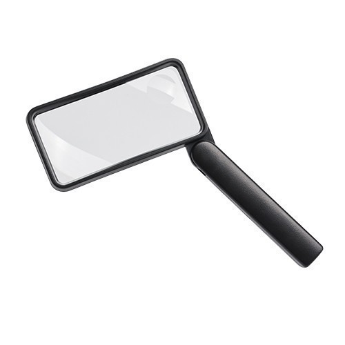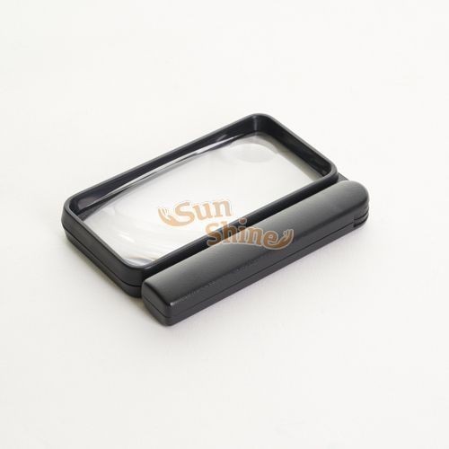 PRODUCT RA-6406 Folding Rectangular Magnifier ● Folded Size / 105 x 75 x 15mm ● Weight / 77g ● Lens / 100 x 50mm--2x / Ø20mm--4x Description The magnifier has a folding handle for adjustable angle and has a protective pouch in soft plastic for carrying with you. Back