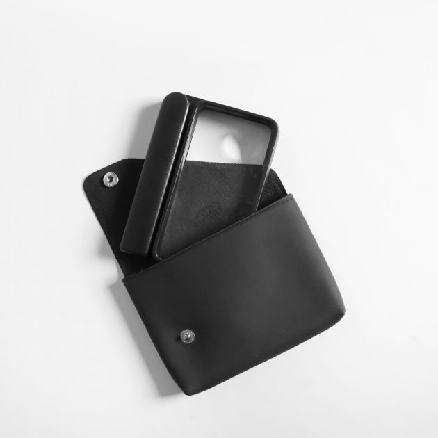 PRODUCT RA-6406 Folding Magnifier ● Folded Size / 105 x 75 x 15mm ● Weight / 77g ● Lens / 100 x 50mm--2x / Ø20mm--4x Description The magnifier has a folding handle for adjustable angle and has a protective pouch in soft plastic for carrying with you. Back