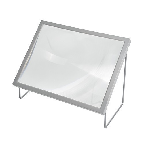 PRODUCT RA-6410 A4 Sheet Stand Magnifier ● Lens Size / 280 x 215mm ● Weight / 280g ● Magnification / 2x ● It comes with a bookstand and 2 kind of stands: flat & tilted. Description Ideal for magnifying your books, craft work or magazines up to 2x. The plastic frame has a choice of two stands for hands free use: one for viewing on a flat surface and the other for using in a tilted position. Back