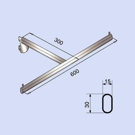 PRODUCT SO-2215 T-Arm Fits for 50mm pitch of upright, oval tube size 15 x 30mm, finished in chrome. Description lLength: 600mm lDepth: 300mm lOval Tube: 30 x 15mm lThickness: 2mm Back