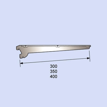 PRODUCT SO-2300 Shelf Bracket Angular shelf brackets for wooden and glass shelves. Sheet steel. Left and right side. Fits for pitch 50mm upright , steel thickness 3mm, finished in chrome. Description SO-2300-300 lDepth: 300mm lThickness: 3mm SO-2300-350 lDepth: 350mm lThickness: 3mm SO-2300-400 lDepth: 400mm lThickness: 3mm Back