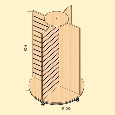 PRODUCT SO-4633 Revolvine Slatwall Unit Revolvine Slatwall display stand. Turn 360° smoothly. EPC Silver metal base. 18mm thickness MDF, plastic-laminated. High quality castors. Description lDia: 1000mm lHeight: 1400mm Back