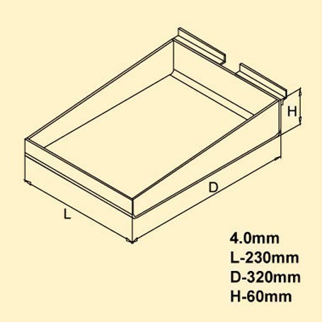 PRODUCT SO-3844 Display Tray Display tray suitable for slatwall system. Made of Acrylic. Description lLength: 230mm lDepth: 320mm lHeight: 60mm lThickness: 4.0mm Back