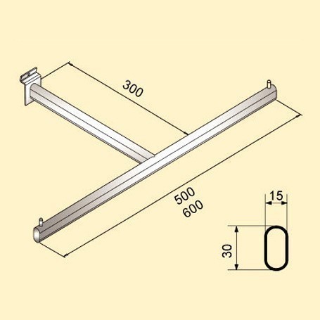 PRODUCT SO-3206 T-Arm "T" shape display accessory suitable for saltwall system. Oval tube size 15x30mm. Finished in chrome. Description SO-3206-500 lLength: 500mm lDepth: 300mm lOval Tube: 30 x 15mm lThickness: 2mm SO-3206-600 lLength: 600mm lDepth: 300mm lOval Tube: 30 x 15mm lThickness: 2mm Back