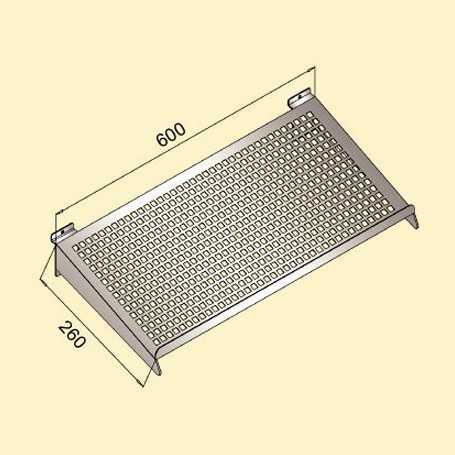 PRODUCT SO-3218 Sloping Shelf Sheet steel. Suitable for slatwall system . Front folded-up. Shelf with holes for screwing-on adapters. Finish in Chrome. Description lDepth: 260mm lLength: 600mm Back