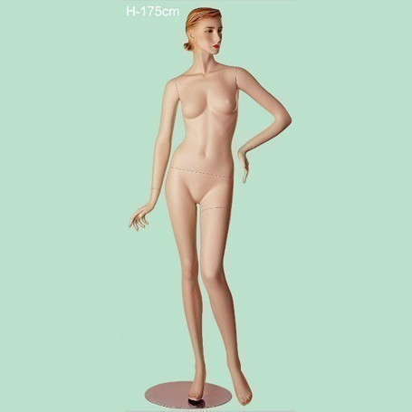 PRODUCT SO-7002 Female Mannequine The body is in sprayed skin colour with a chrome metal base plate. Easy to assemble. Description lHeight: 175cm Back