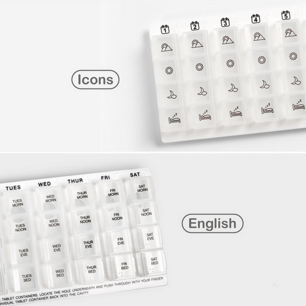 PRODUCT HA-4140 Week-Day Pill Dispenser ● Size / 226 x 125 x 25mm ● Weight / 161g ● DO NOT use in the dishwasher. ● DO NOT use UV light to disinfect the product. ● Icon and English version available. Description This is ideal for people who take larger numbers of tablets more frequently each day. It has four clearly marked compartments for breakfast, lunch, dinner and bedtime. It is also marked with each weekday. Back