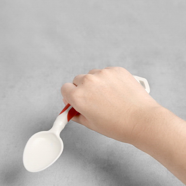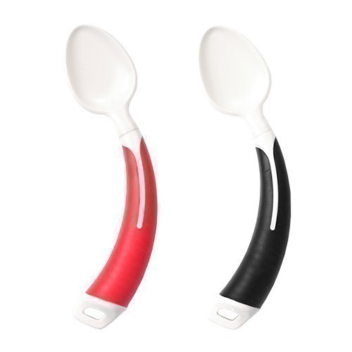 PRODUCT HA-4361 Curved Spoon (Right-Handed) ● Length / 170mm ● Weight / 36g ● Color available in black, red. ● Household dishwasher safe up to 70ºC. ● DO NOT use UV light to disinfect the product. Description This Curved Spoon has ergonomically contoured handles that makes it easier to grip and require little wrist movement in order to improve control for users with arthritis or a weak grip. Back