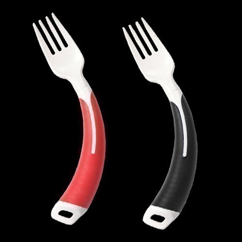 PRODUCT HA-4365 Curved Fork (Right-Handed) ● Length / 170mm ● Weight / 36g ● Color available in black, red. ● Household dishwasher safe up to 70ºC. ● DO NOT use UV light to disinfect the product. Description This Curved Fork has ergonomically contoured handles that makes it easier to grip and require little wrist movement in order to improve control for users with arthritis or a weak grip. Back