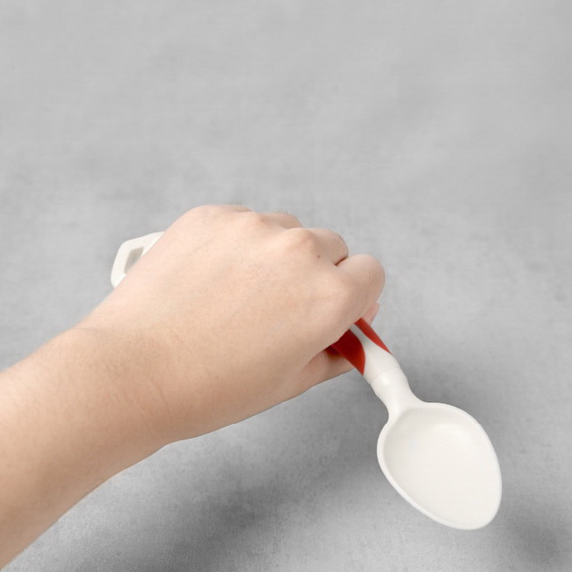 PRODUCT HA-4371 Curved Spoon (Left-Handed) ● Length / 170mm ● Weight / 36g ● Color available in black, red. ● Household dishwasher safe up to 70ºC. ● DO NOT use UV light to disinfect the product. Description This Curved Spoon has ergonomically contoured handles that makes it easier to grip and require little wrist movement in order to improve control for users with arthritis or a weak grip. Back