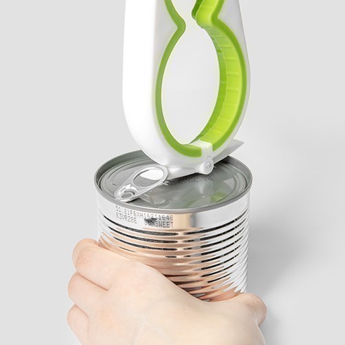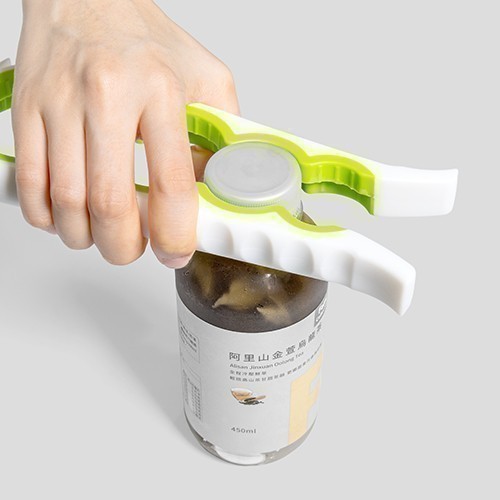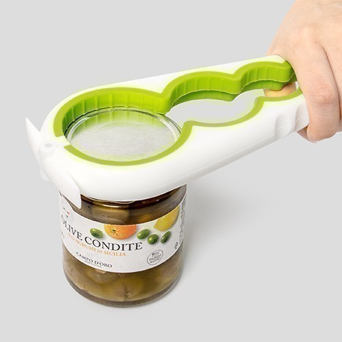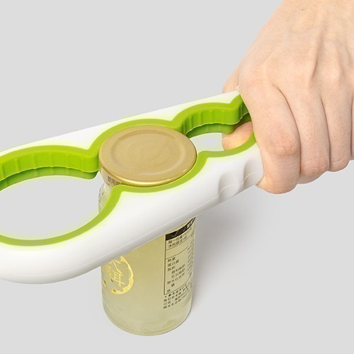 PRODUCT HA-4281 5-IN-1 Jar Opener ● Length / 228mm ● Weight / 116g ● Fit lids size from 25mm-85mm Description With four different sized openig and a non-slip interior, it can easily fit various size of screws-top lids. The hook at the top is designed for opening pull-tab cans. Back