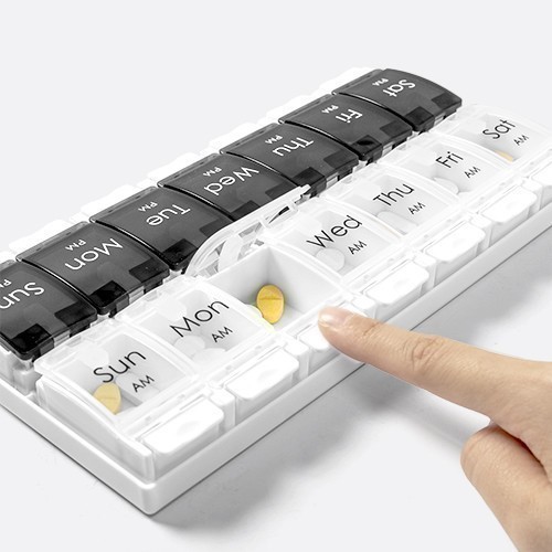 PRODUCT HA-4146 Push Button AM/PM 7 Days Pill Dispenser ● Size / (L) 228 x (W) 1155 x (H) 27mm ● Weight / 180g ● DO NOT use in the dishwasher. ● DO NOT use UV light to disinfect the product. Description Each compartment can be opened individally with the push button. Medications for the week are easily planned and organized in daily, marked compartments. Back